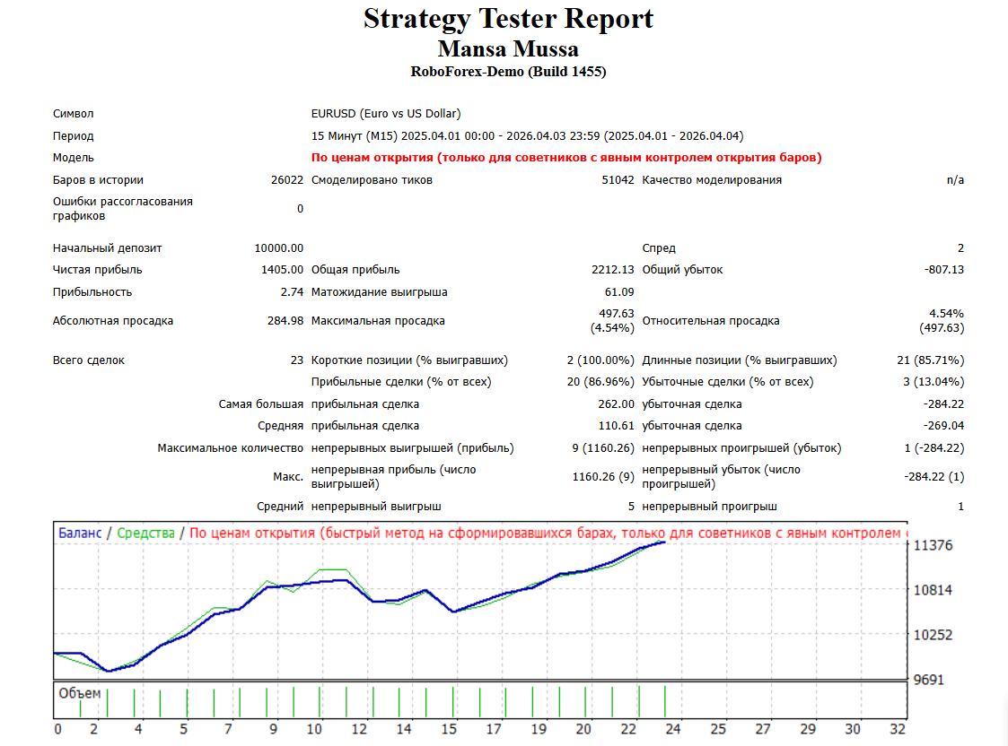 Подробное описание советника Mansa Mussa и отзывы о нем. Данный советник разработан для торговли по тренду с использованием адаптивных алгоритмов, основанных на волатильности рынка. Он сочетает в себе надежные классические индикаторы и динамическую систему фильтрации сигналов.